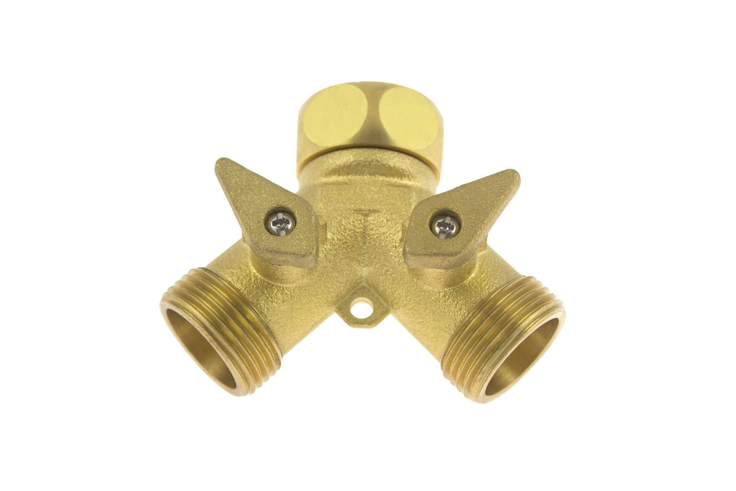 Solid brass Tap Manifold or Y connector. With screw direct to any 3/4 inch BSP tap providing 2 x 3/4 inch outlets Each outlet has an on/off tap which means you could fit one outlet to a timer / automatic water system and still use other to fill watering cansÂ