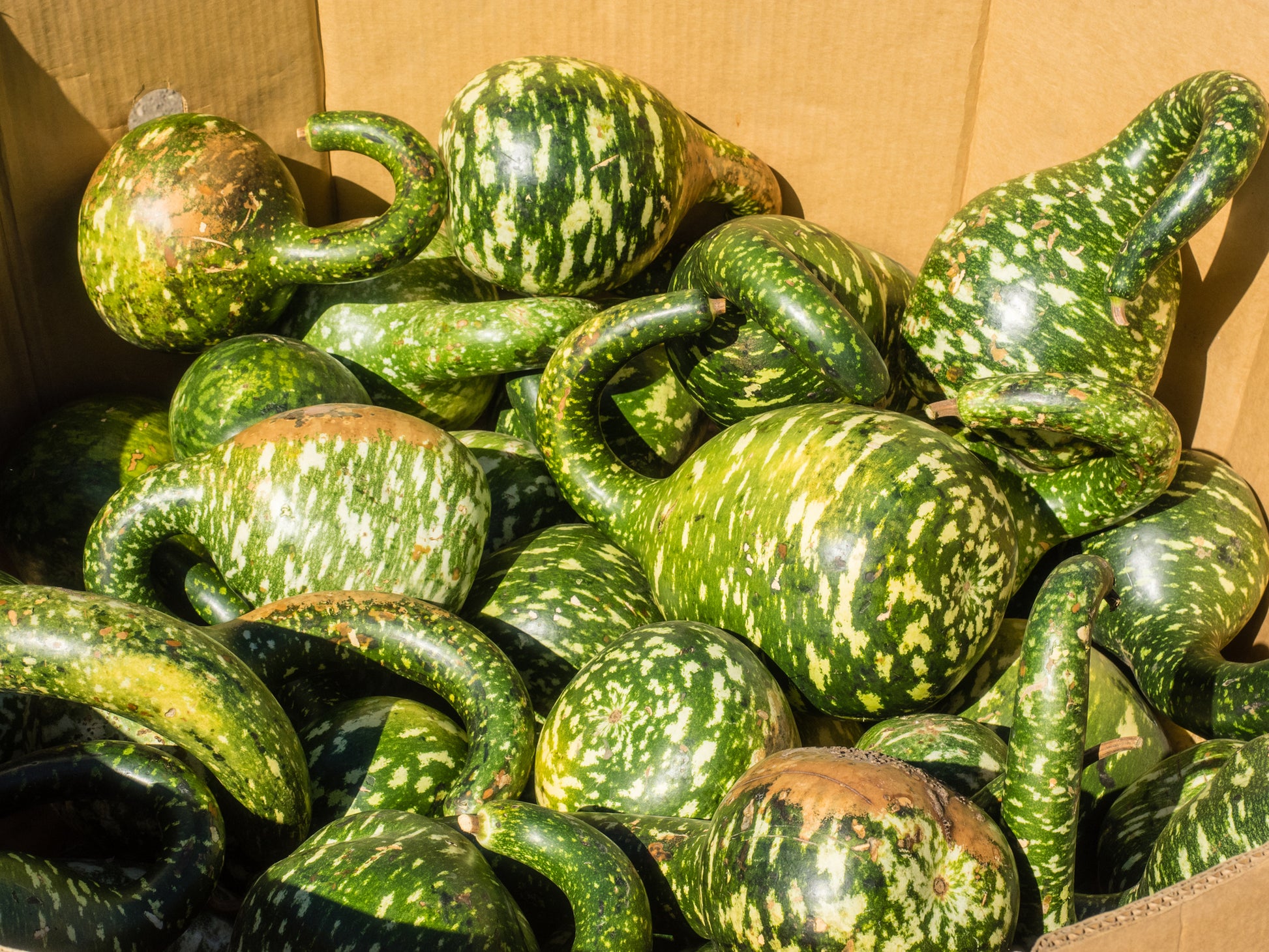 Ornamental gourds with graceful swan-like shapes and speckled patterns