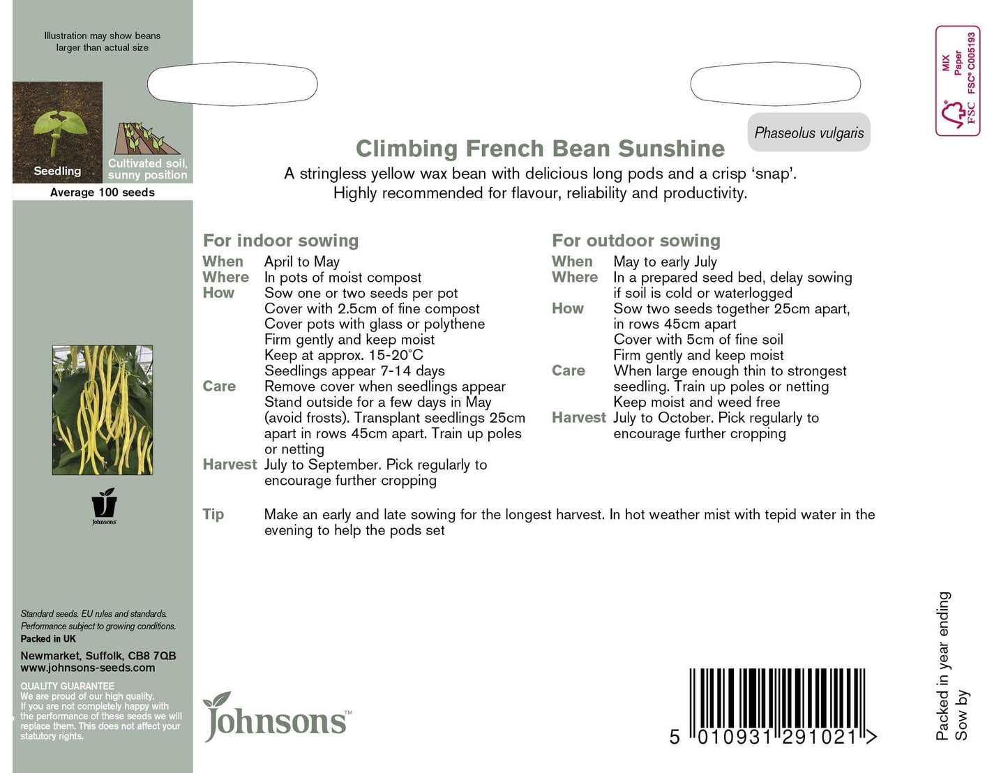 Johnsons Seeds Climbing French Bean Sunshine 50 Seeds