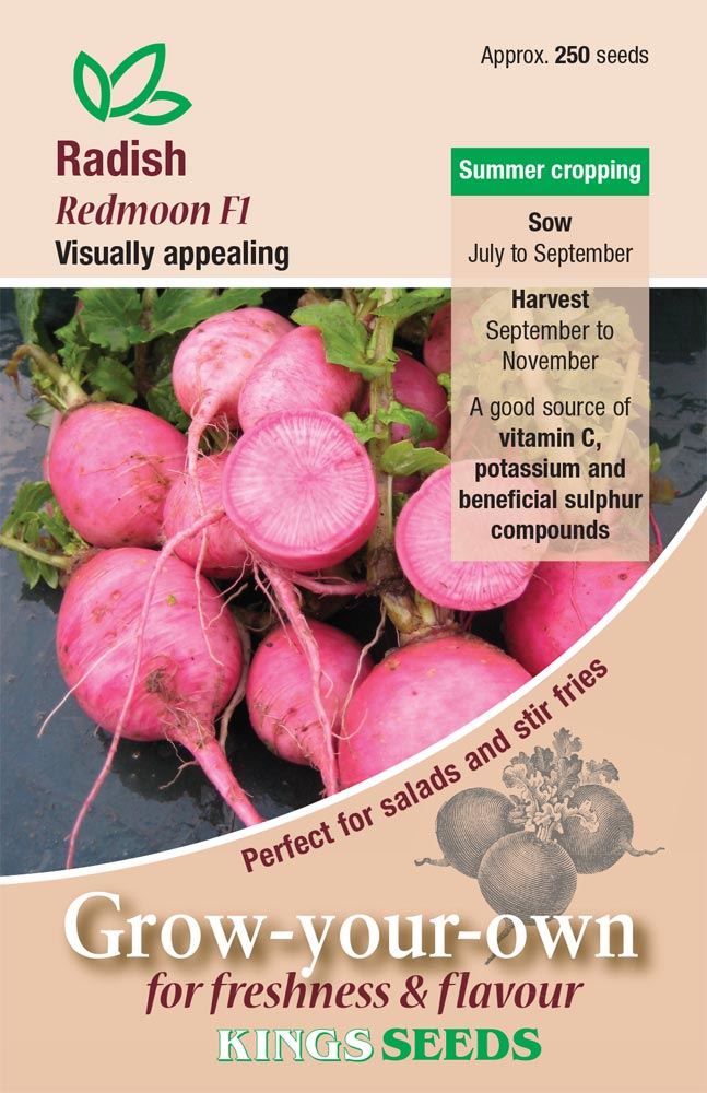 Kings Seeds - Vegetable - Radish Redmoon :- These have appealing conical shape roots, red skin and rose-pink flesh. Mild and refreshing flavour. With its crisp texture, and visually appealing when sliced into salads. Best sown late summer for autumn harvesting.