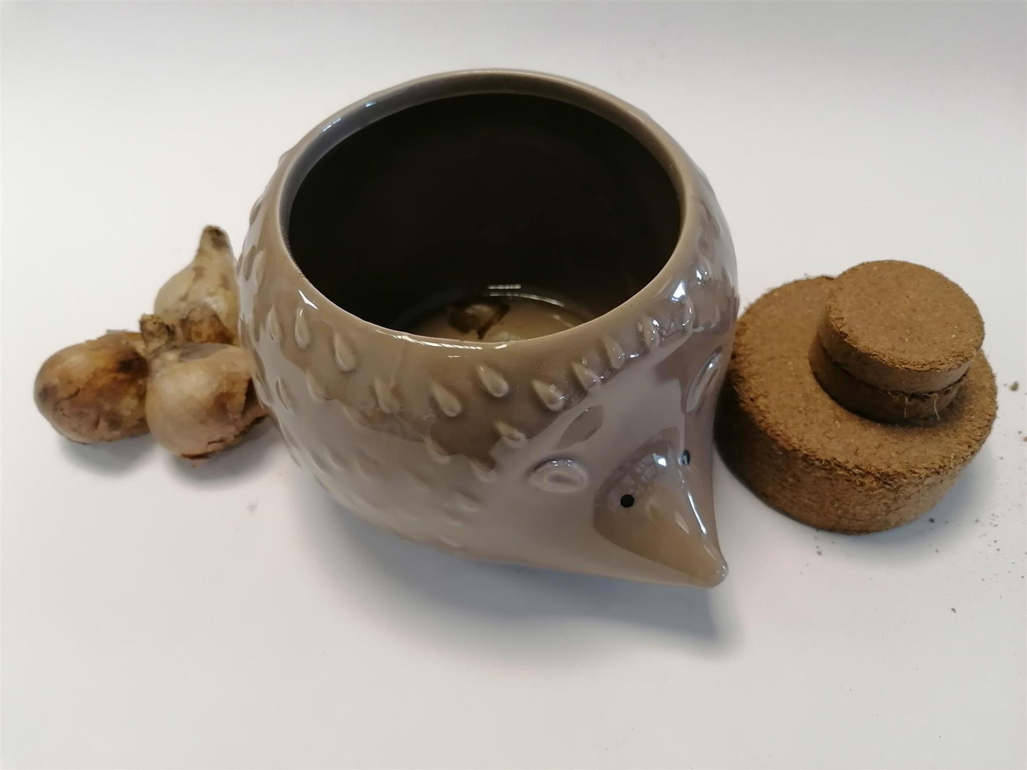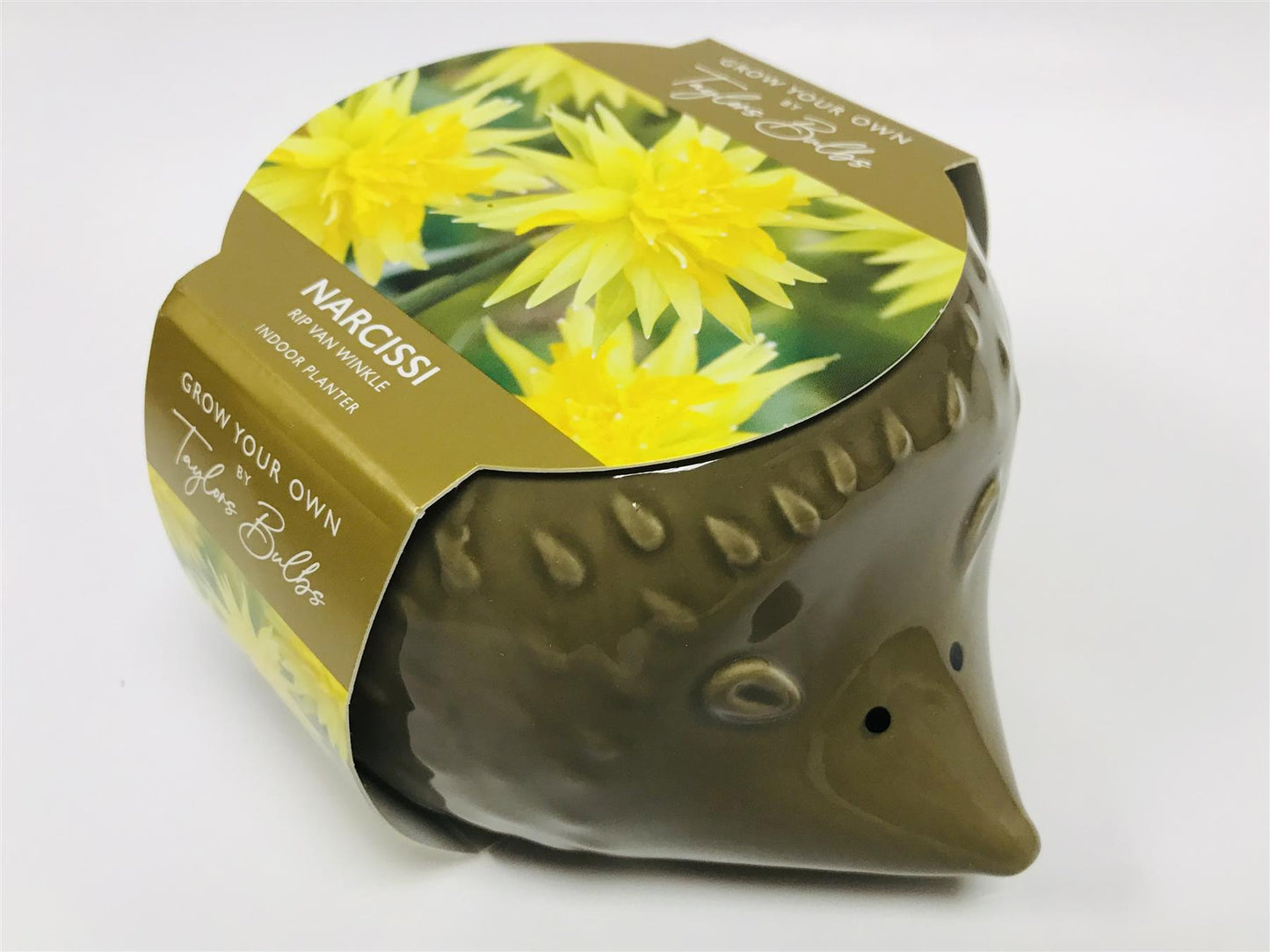Novelty hedgehog ceramic planter with 3 Narsissi Tete Boucle bulbs, compost and growing instructions.
